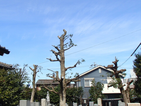 お寺の墓地に生えている大きな木。長年剪定をしていませんでした。3月に思い切って強剪定を行いました。墓石に落ちないようにコンパネで養生し、慎重に作業しました。今後は、毎年剪定をする予定です。