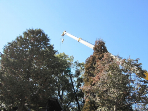 神社のお社の上に木の枝が覆い被さっていたので、クレーンと高所作業車を使って剪定しました。